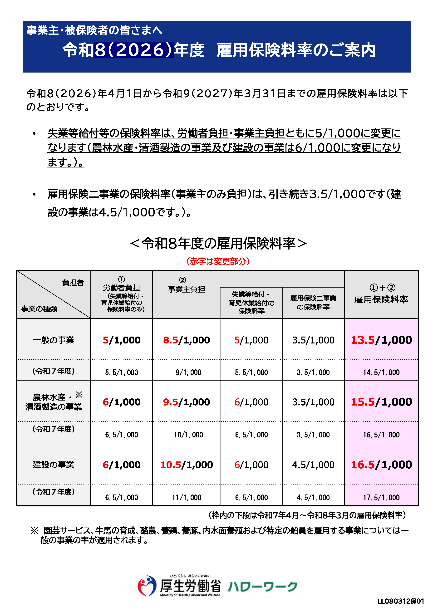 厚生労働省より、令和8年度の雇用保険料率が変更になるとの発表がありました。